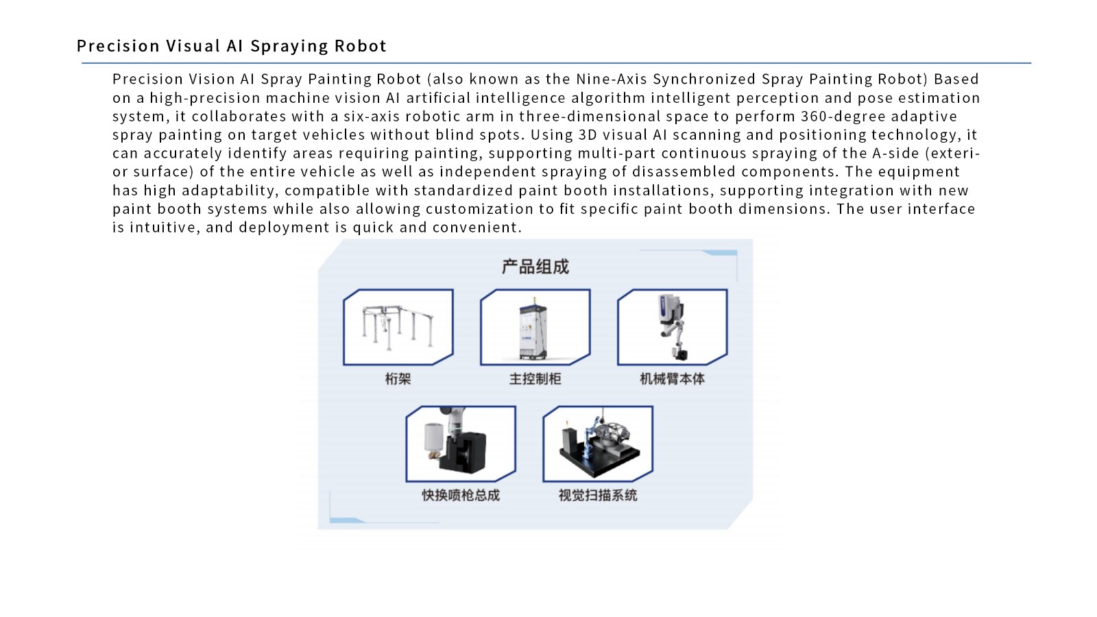 Precision Vision AI Spray Painting Robot (also known as the Nine-Axis Synchronized Spray Painting Robot) Based on a high-precision machine vision AI artificial intelligence algorithm intelligent perception and pose estimation system, it collaborates with a six-axis robotic arm in three-dimensional space to perform 360-degree adaptive spray painting on target vehicles without blind spots. Using 3D visual AI scanning and positioning technology, it can accurately identify areas requiring painting, supporting multi-part continuous spraying of the A-side (exterior surface) of the entire vehicle as well as independent spraying of disassembled components. The equipment has high adaptability, compatible with standardized paint booth installations, supporting integration with new paint booth systems while also allowing customization to fit specific paint booth dimensions. The user interface is intuitive, and deployment is quick and convenient.