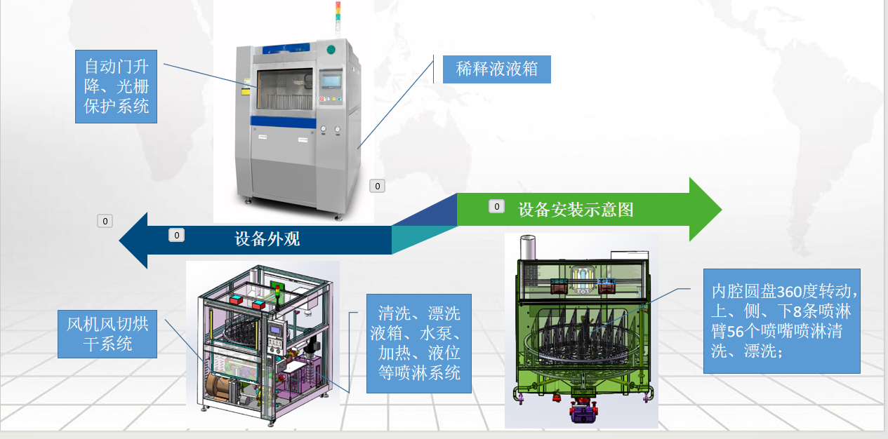 3、科學的噴嘴設計(專利):采用上、中、下共8條噴淋臂分布--徹底解決清洗盲區,噴淋臂、噴嘴可拆卸;4、可視化噴嘴壓力可調節:解決了小工件尺寸在清洗中受高壓噴淋條件下的碰撞、飛濺問題;