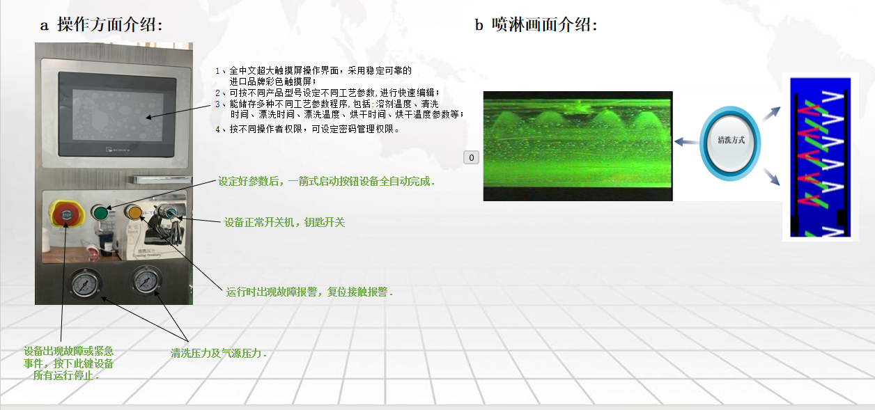 7、清洗、漂洗采用在線獨立的內置過濾系統、獨立的電動泵、獨立的噴淋臂、獨立的噴嘴,溶劑的循環7、使用,防止清洗和漂洗盡少串液,可提升漂洗水使用壽命,減少溶劑用量;