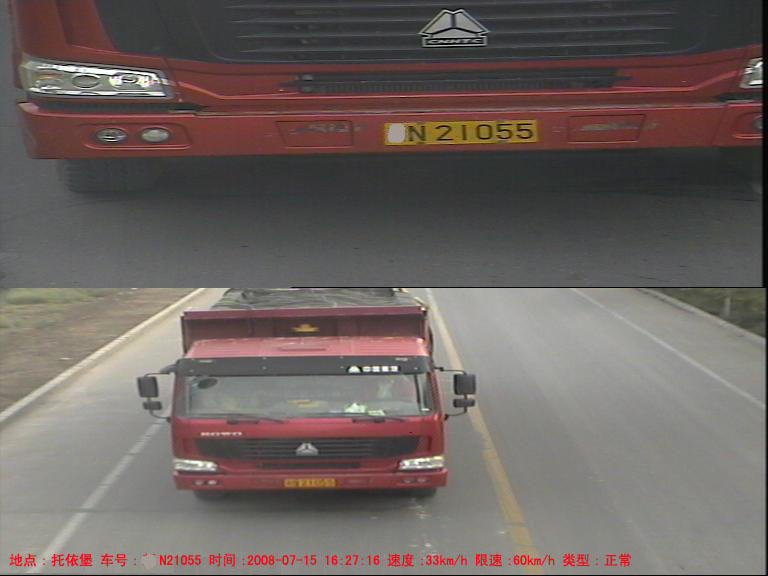 系統對通過檢測線圈的每個車輛進行圖像抓拍,包括特征圖像(車頭特寫)及車輛全景圖像兩張彩色圖片,每個圖片的分辨率為768*288,24bit真彩色。在抓拍圖像中,系統能夠將檢測到的車輛基本信息,如日期、時間、地點、方向、牌照號、車速、車輛類型(嫌疑、超速、正常)等疊加在全景圖像上,便于人工判別及事后取證。