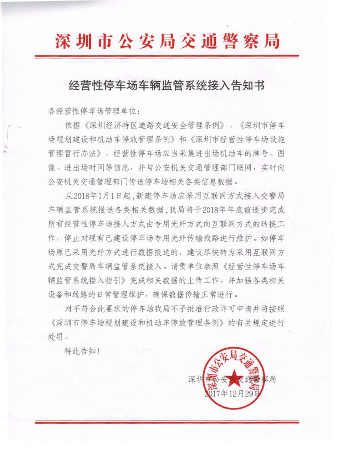 根據《深圳市停車場規劃建設和機動車停放管理條例》、《深圳市經營性停車場設施管理暫行辦法》(以下簡稱《辦法》),經營性停車場應當安裝滿足《辦法》要求的機動車監控設施,采集進出場機動車的車牌、圖像、進出場時間等信息,并實時向公安機關交通管理部門報送。